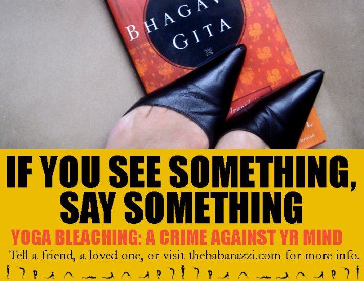 I get what you’re saying, but maybe the image is simply capturing exactly that? That all this celebriyogi/yoga bleaching stuff is akin to some clueless person’s high heeled shoes standing on the sacred Bhagavad Gita. As that is what its doing, offensive to where all of this comes from and needed a powerful image.